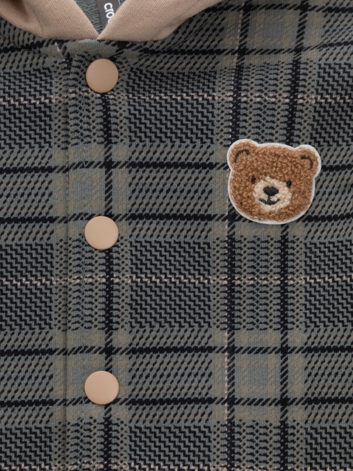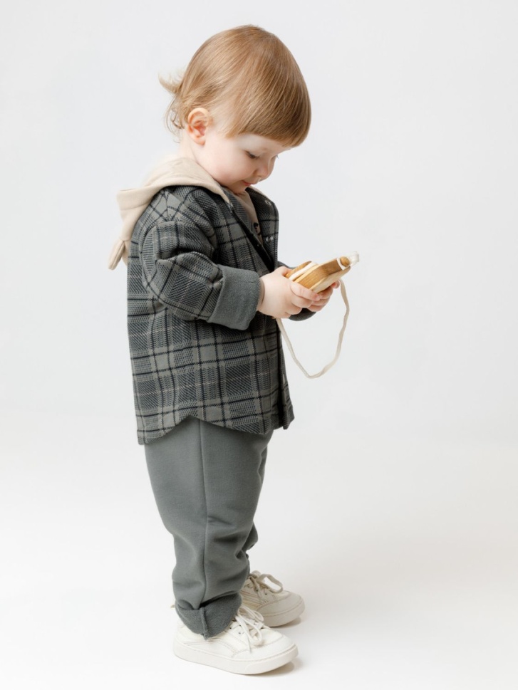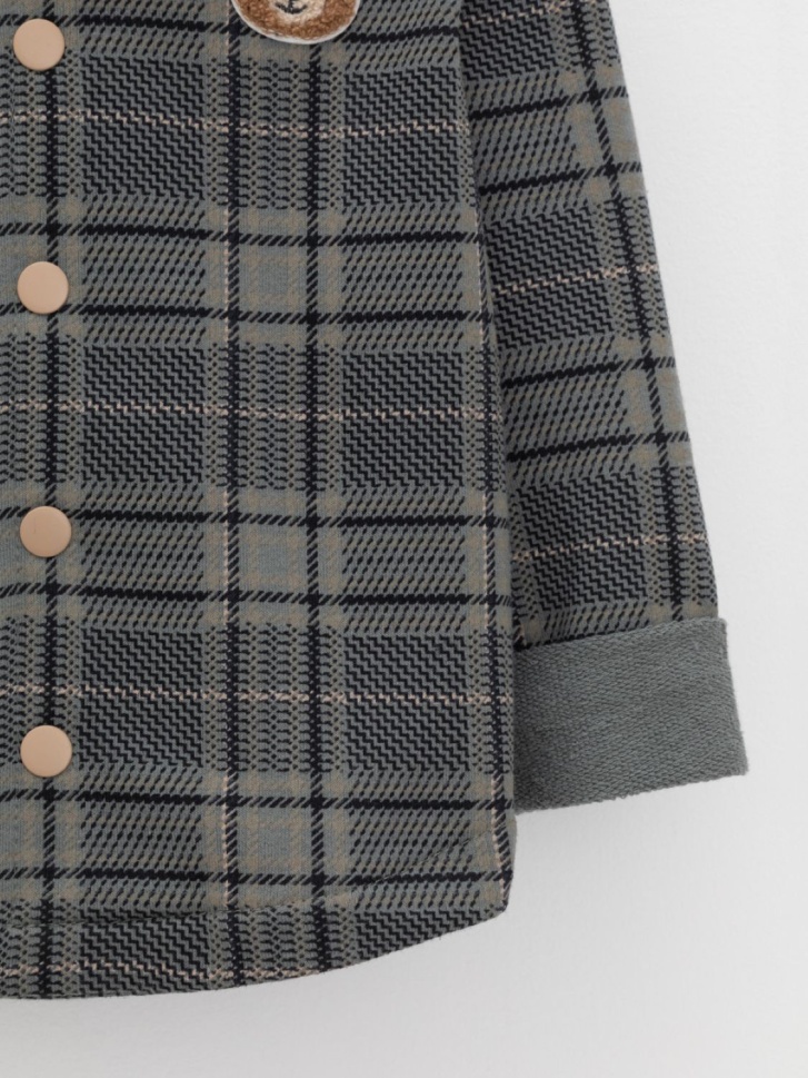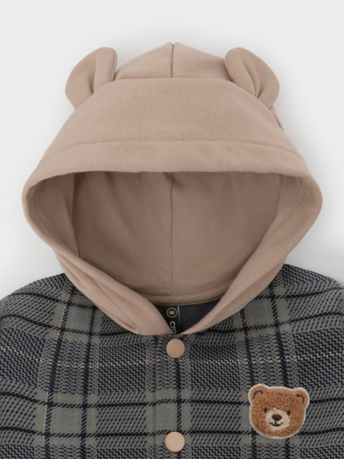 Свободная трикотажная рубашка для мальчика из мягкого петельчатого футера трёхнитки. В составе 80% натурального хлопка и 20% полиэстера, при этом полиэстер ввязан внутрь по особой технологии и не соприкасается с кожей. Застёгивается на кнопки. Модель с капюшоном и декоративными ушками. Рисунок в клетку выполнен из стойких текстильных гипоаллергенных красителей. Изделие сохраняет цвет и форму после многократных стирок. Все трикотажные полотна производятся в соответствии с нормами швейцарского сертификата ЭкоТекс.