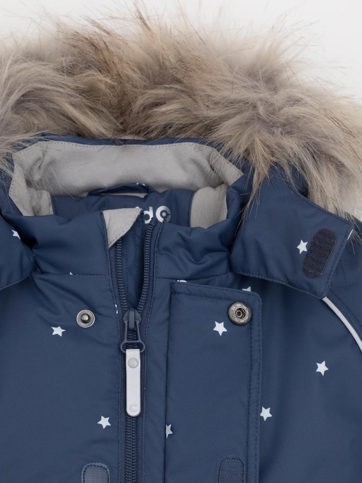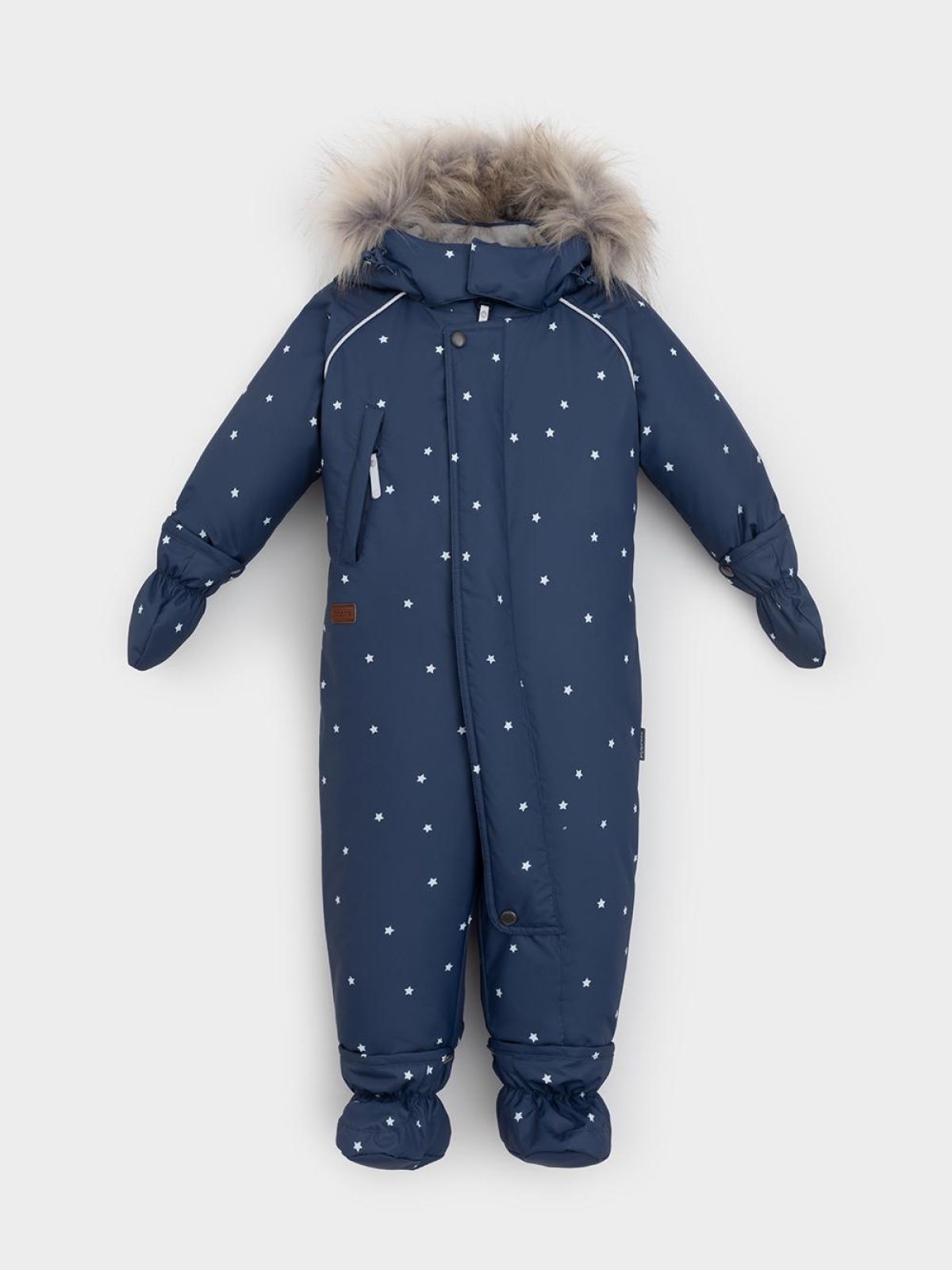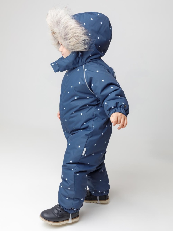 Зимний комбинезон ясельный с утеплителем SEE®: 300 г/м2. Выполнен из мембранной ткани с дополнительной тефлоновой обработкой, которая предохраняет изделие от загрязнений и отталкивает влагу. Подклад выполнен из 100% хлопка. Комбинезон застёгивается на молнию и внешнюю планку на липучках, предусмотрена защита подбородка. Несъёмный капюшон имеет эластичную утяжку со стопперами и отстёгивающийся мех на молнии. Резинка по спинке для лучшего прилегания. На груди карман на молнии. По рукавам и низу изделия эластичные манжеты, на ножках отстёгивающиеся силиконовые штрипки. В размерах 74-80 и 80-86 в комплекте идут рукавицы и пинетки. Во всех изделиях верхнего ассортимента для безопасности ребёнка предусмотрены светоотражающие элементы.