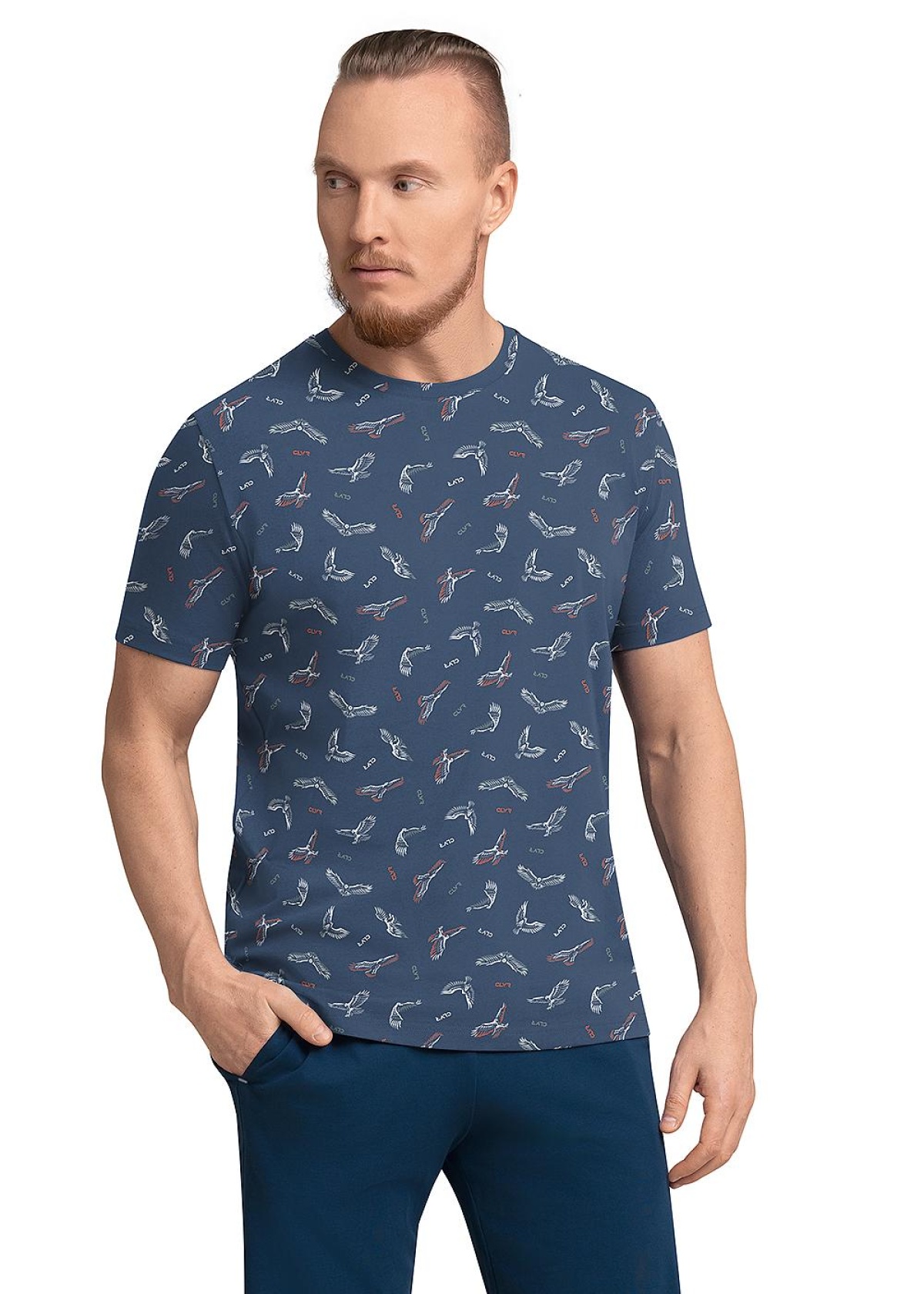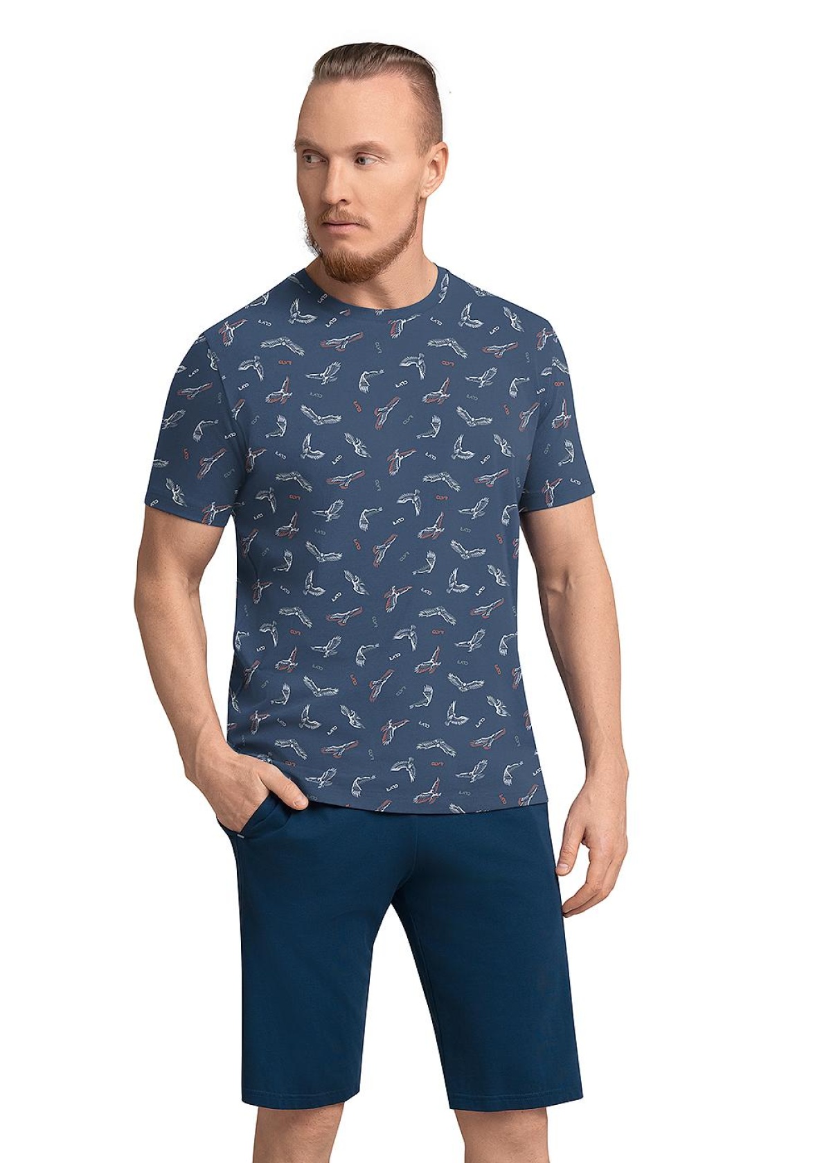 Комплект мужской для дома, состоящий из футболки и шорт. Футболка из трикотажного полотна с круглым вырезом горловины и короткими рукавами дополнена стильной авторской набивкой. Шорты из плотного трикотажного полотна со шнуром и функциональными боковыми карманами.