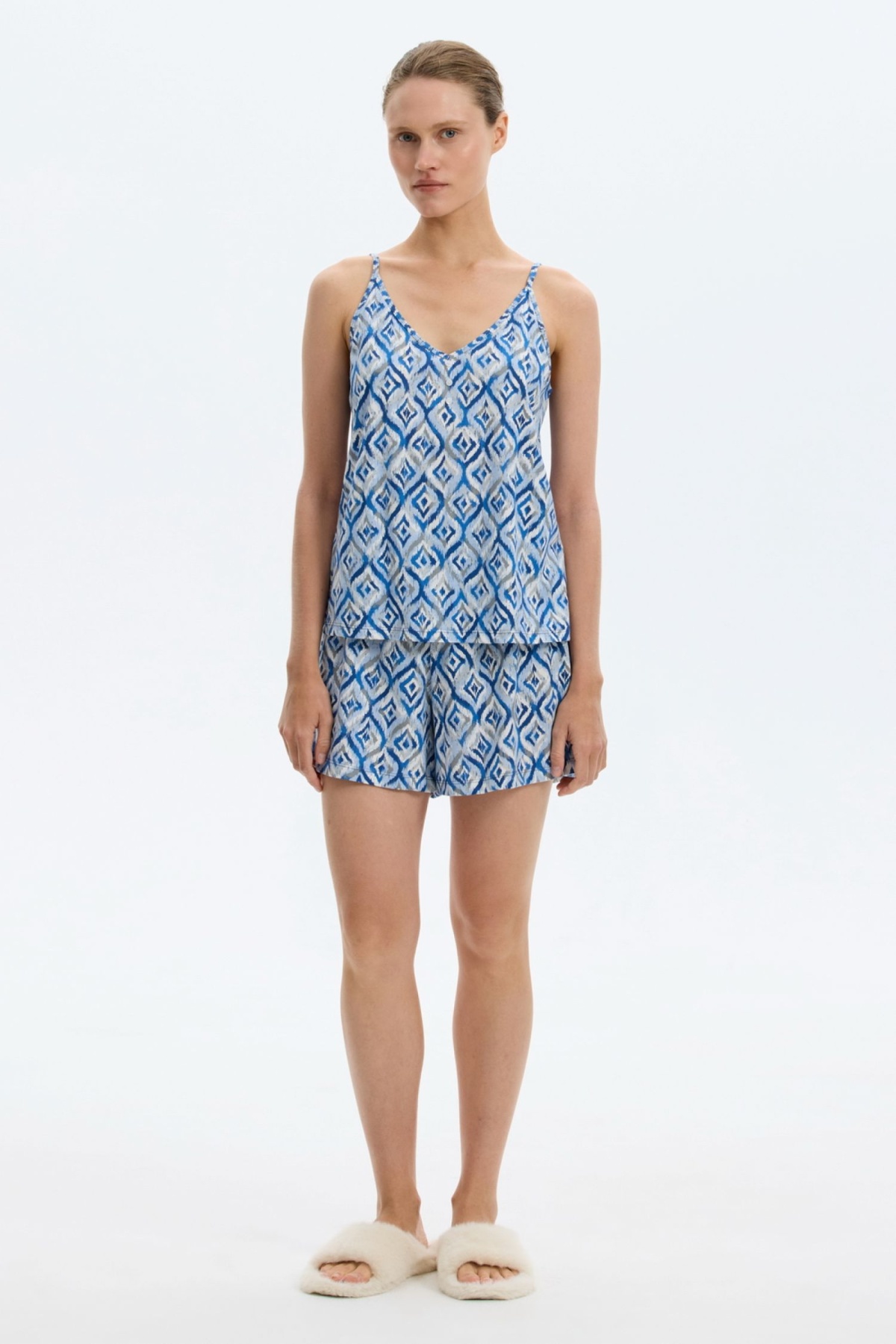 Комплект из хлопка с нежнейшим модалом выполнен с вниманием к деталям. Регулируемые бретели позволяют подстроить их под ваши индивидуальные предпочтения, а комфортный пояс шорт обеспечивает свободу движений.