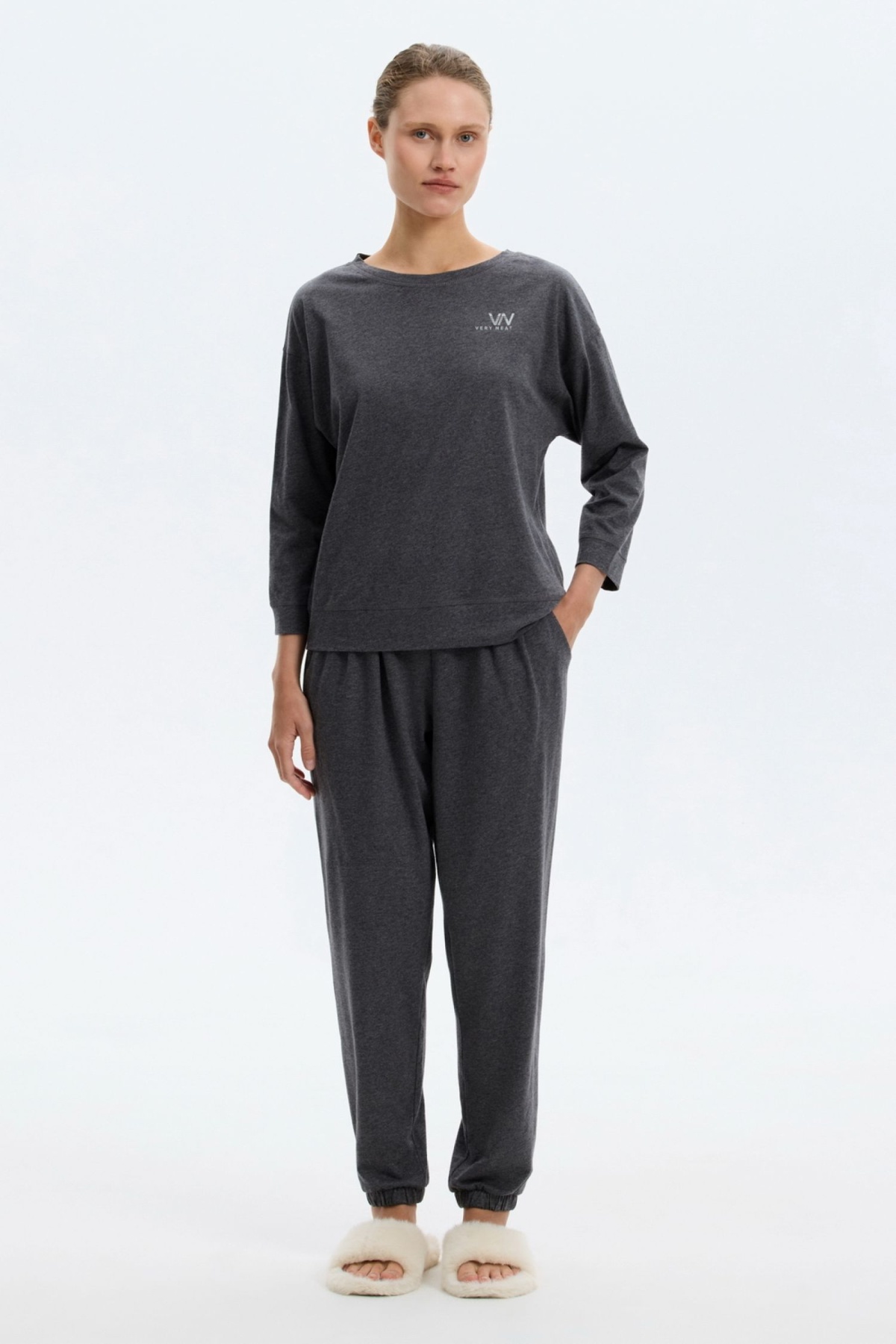 Домашний уют с комплектом из высококачественного хлопка. Зауженный крой брюк и джемпер со спущенным плечом созданы для придания максимального комфорта.